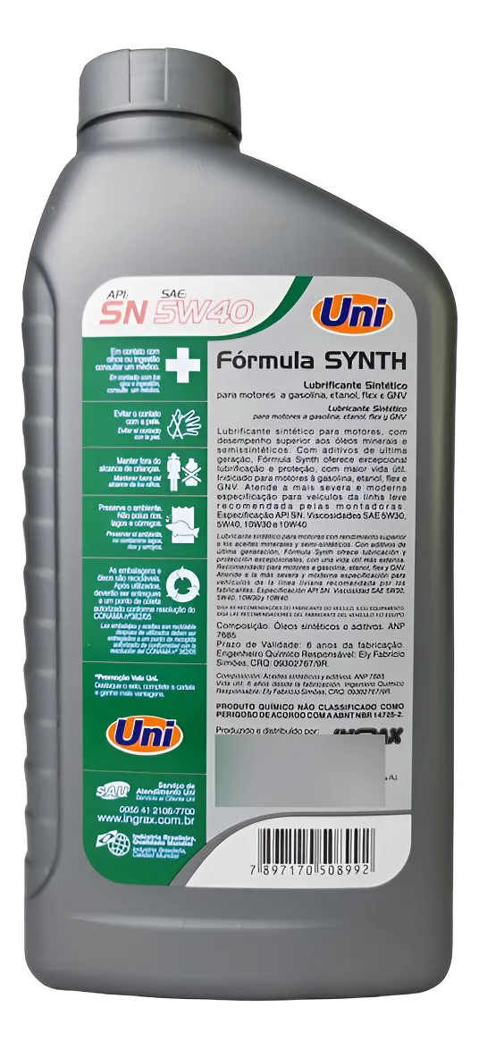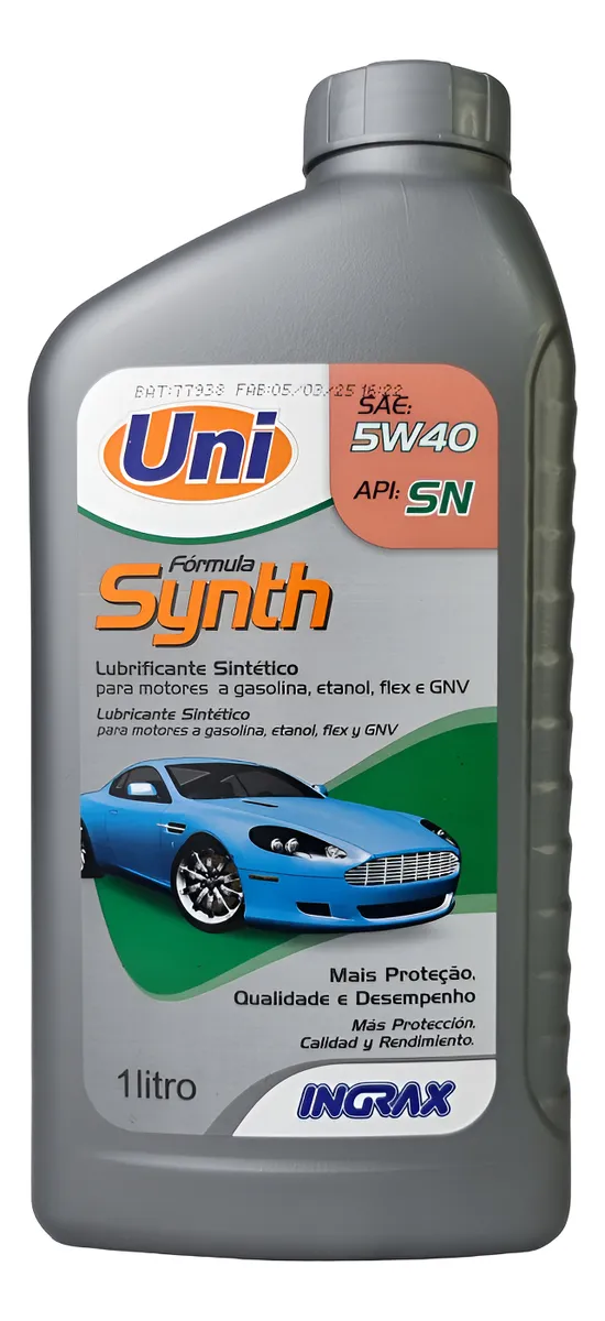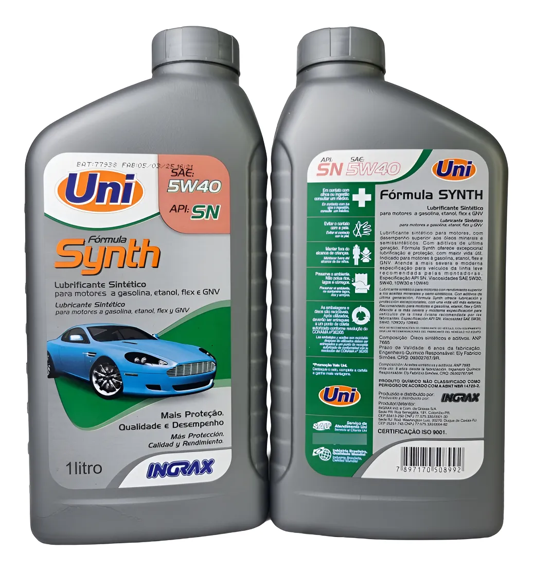 Óleo Lubrificante Uni Fórmula Synth SAE 5W40 API SN – 1 Litro Eleve o desempenho do seu veículo com o Uni Fórmula Synth SAE 5W40 API SN, o lubrificante sintético ideal para motores a gasolina, etanol, flex e GNV! Desenvolvido pela renomada Ingrax, este óleo de 1 litro oferece: 1. Proteção Superior: Certificação API SN garante máxima proteção contra desgaste, oxidação e depósitos, prolongando a vida útil do motor. 2. Desempenho em Qualquer Temperatura: Com viscosidade 5W40, assegura fluidez em baixas temperaturas para partidas a frio e resistência em condições quentes. 3. Versatilidade: Compatível com diversos tipos de motores, ideal para carros modernos e exigentes. 4. Qualidade e Rendimento: Formulado com óleos sintéticos e aditivos de alto desempenho, proporciona maior eficiência e economia. Aproveite a certificação ISO 9001 e a confiança de uma marca reconhecida. Garanta agora o cuidado que seu motor merece e eleve sua experiência ao volante! Compre já e receba com segurança!